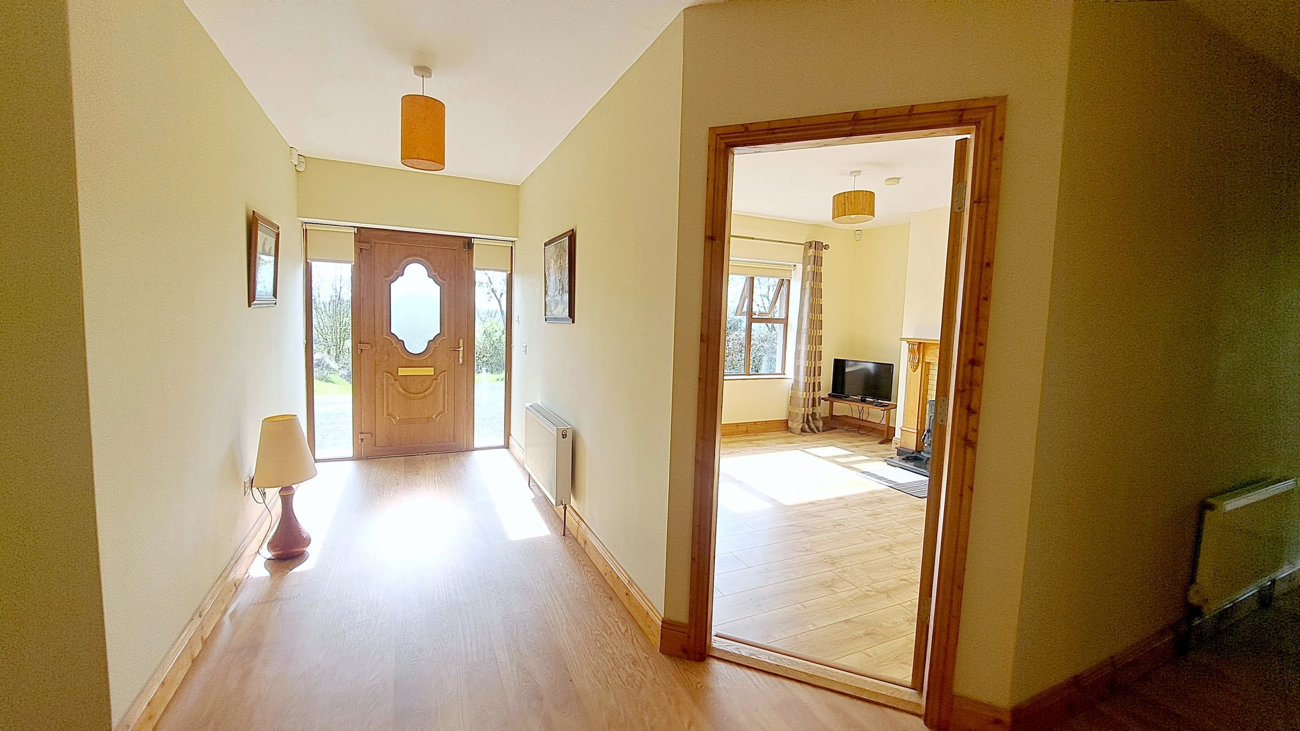 Entrance Hall: 3.05 m x 3.3 m, A spacious and light-filled entrance hall featuring a decorative timber front door with glazed sidelights fitted with roller blinds, timber floor, radiator, power points.