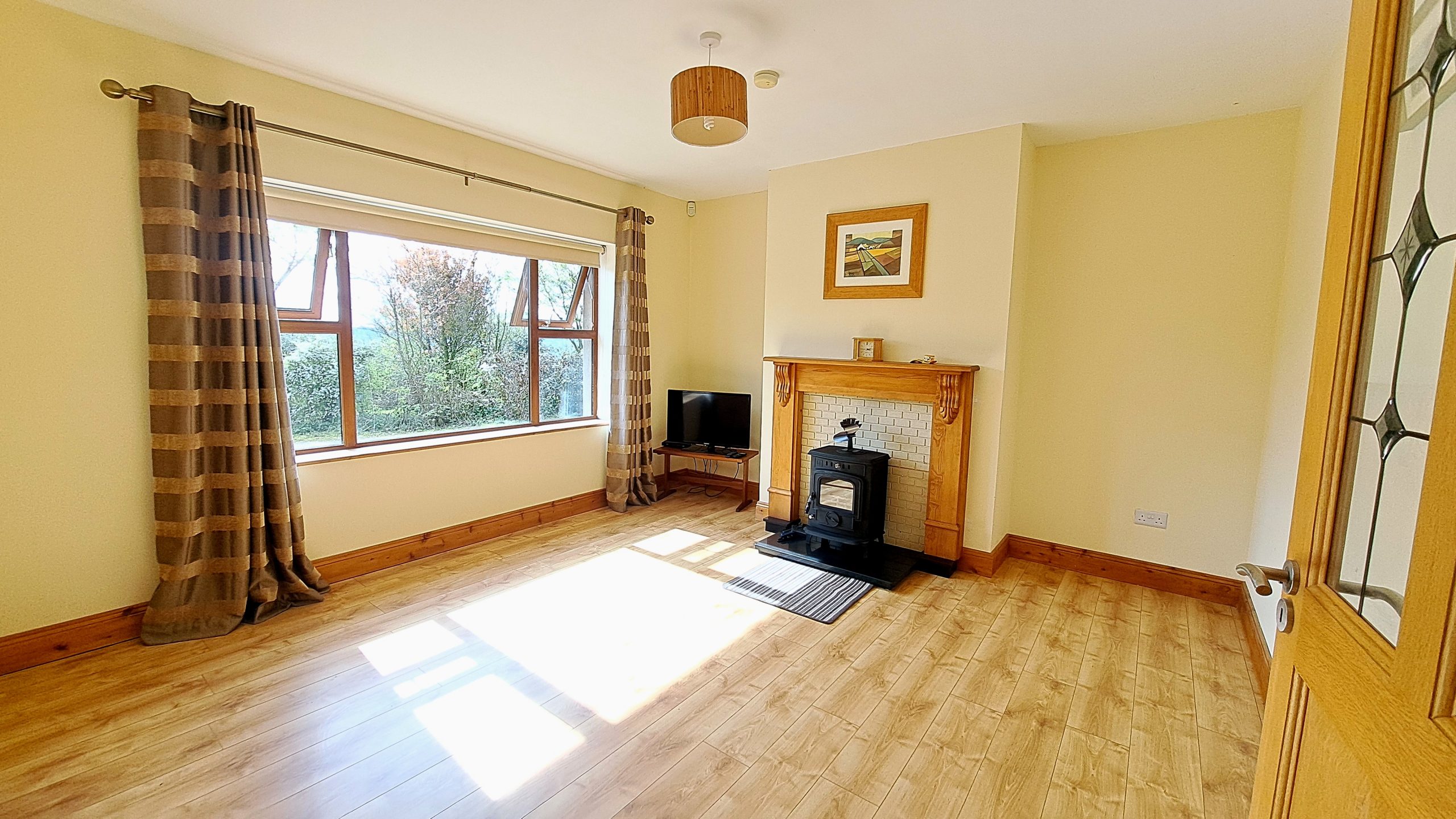 Livingroom: 4.25 m x 4 m, bright and beautifully presented livingroom featuring a large picture window fitted with roller blinds, wood-burning stove set within a traditional timber mantelpiece and a tiled inset, timber floor, T.V. & power points and radiator.
