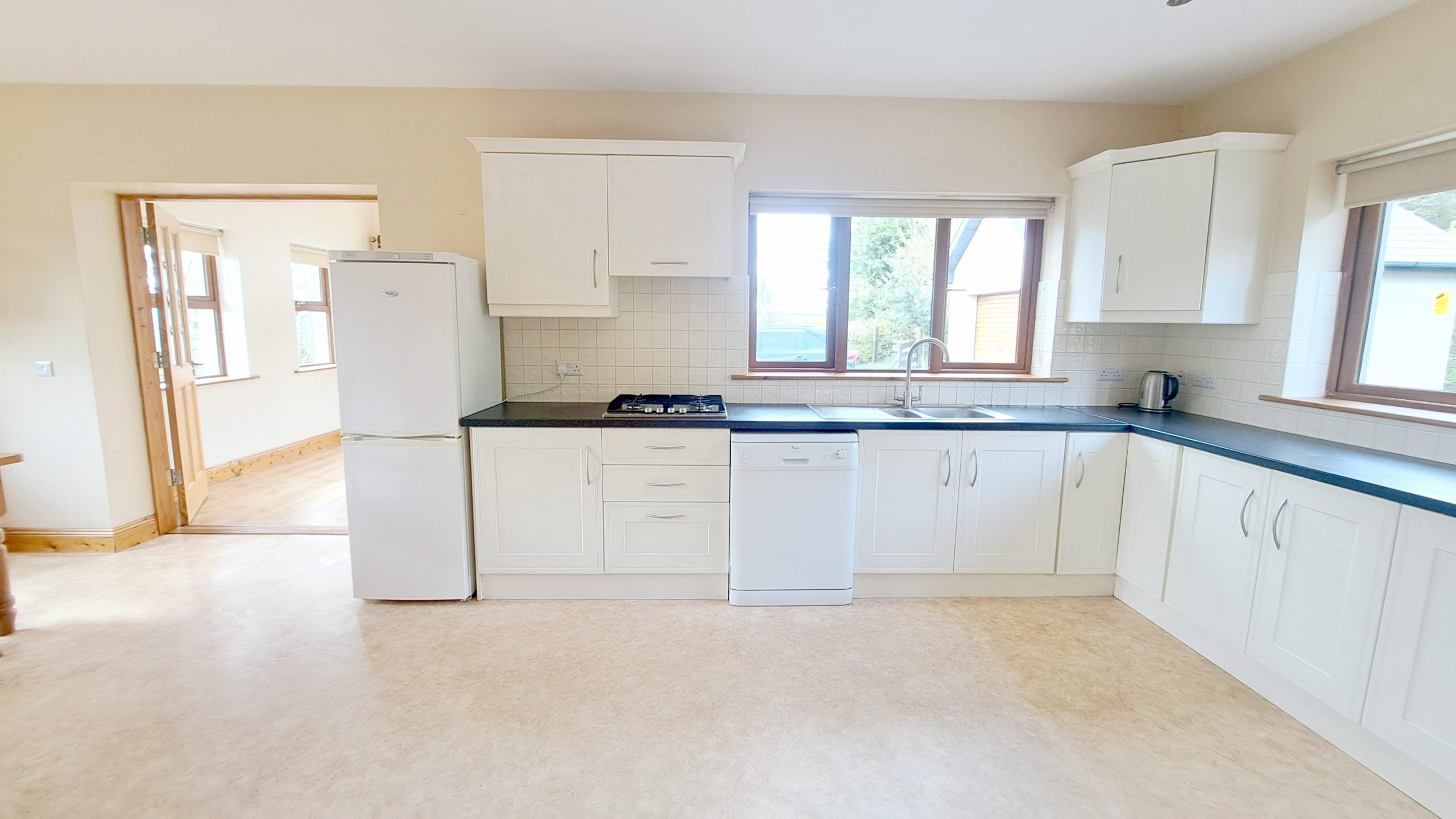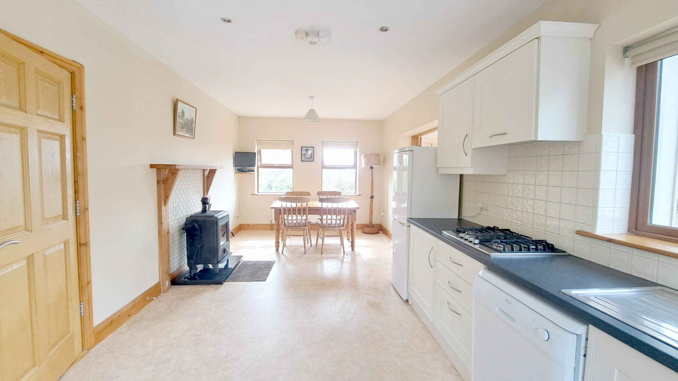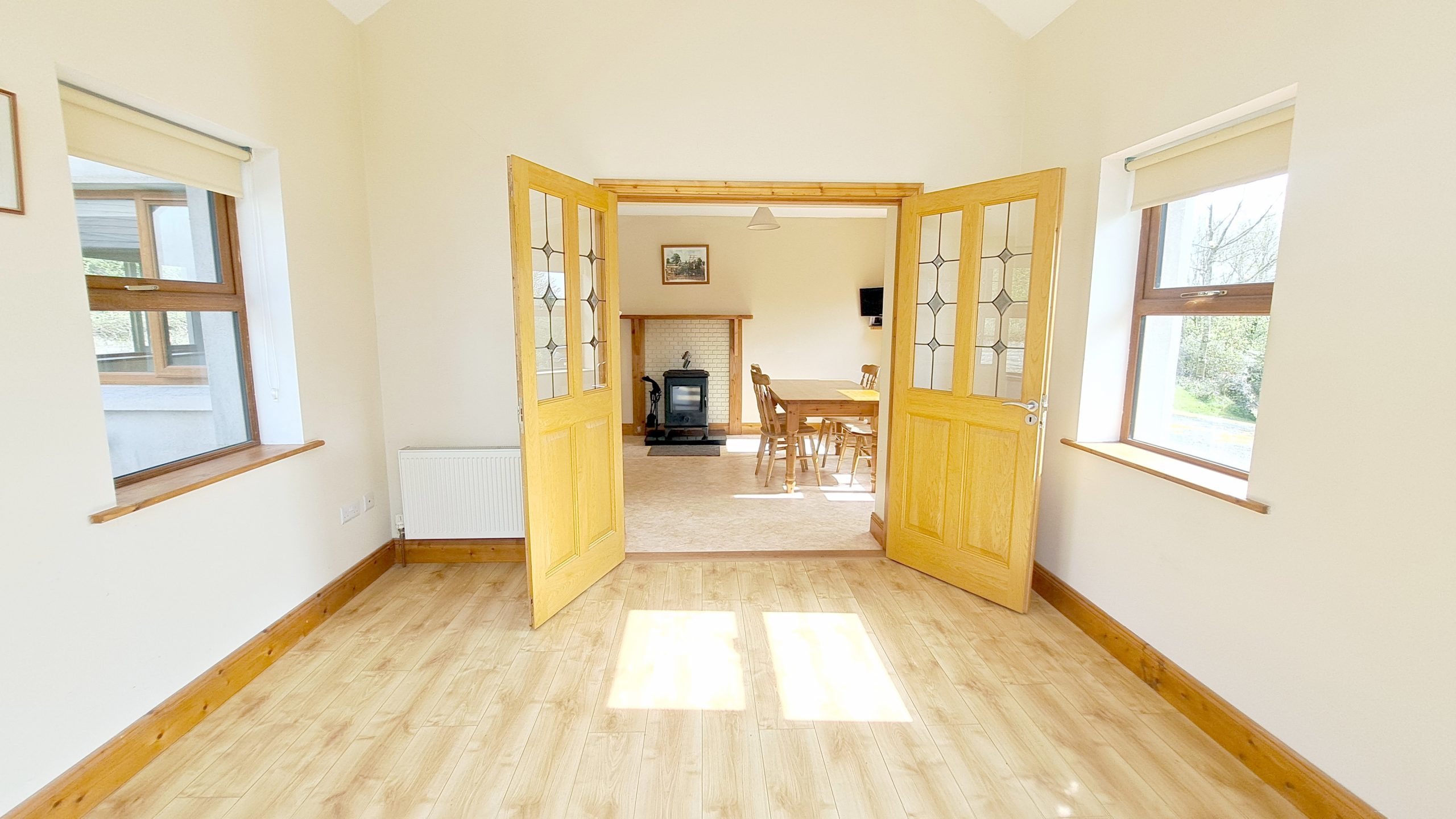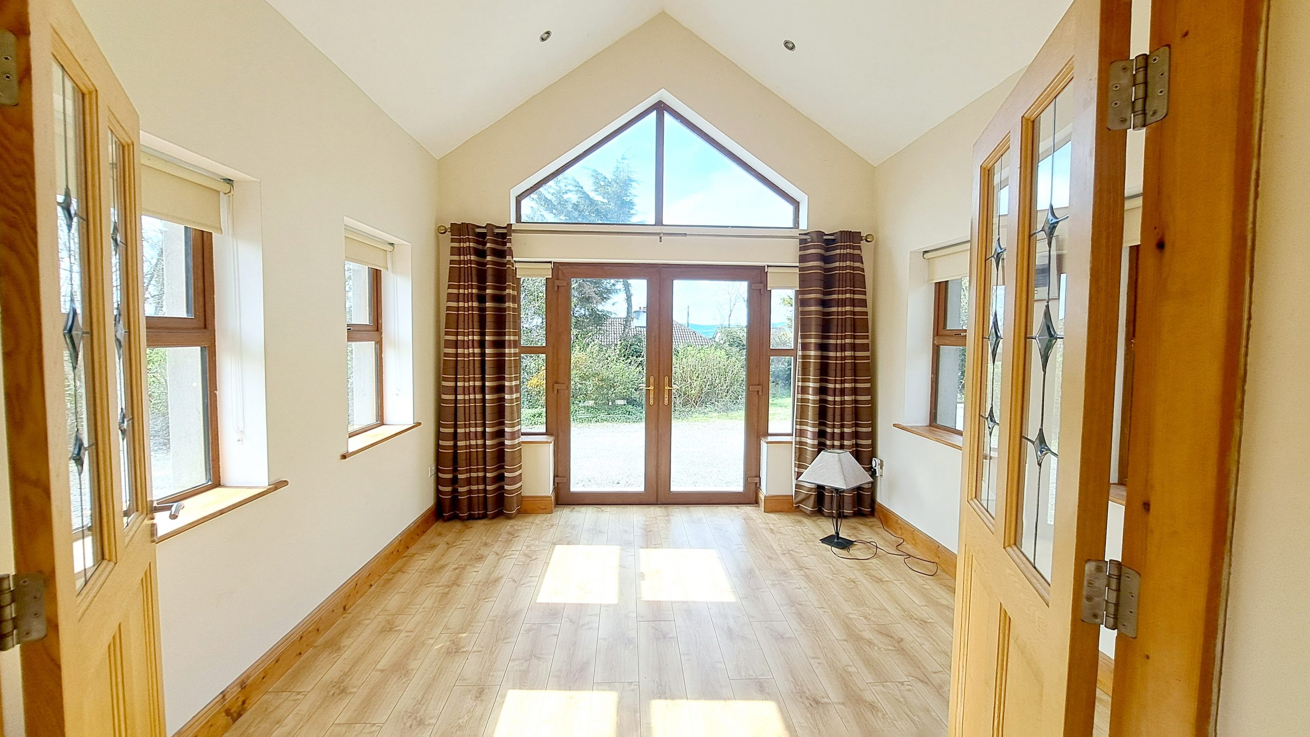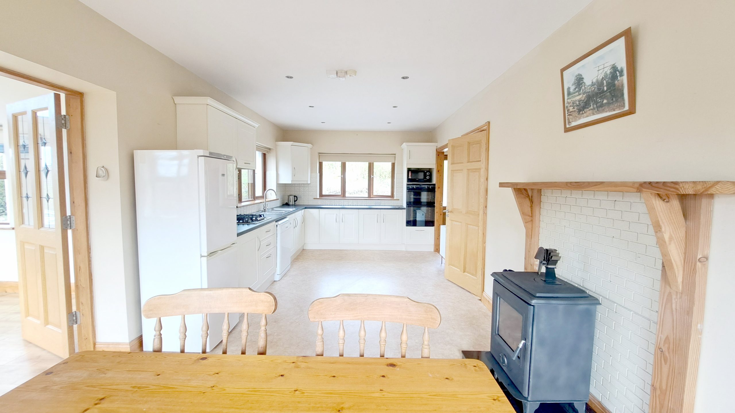 Kitchen/Diningroom: 7.4 m x 3.35 m, expansive open-plan kitchen/dining room with split level cream kitchen units with built-in electric oven and microwave, gas hob, wood-burning stove with timber surround, 3 windows fitted with roller blinds, laminated flooring, radiator, power points, recessed lighting, double French doors to Sun room.