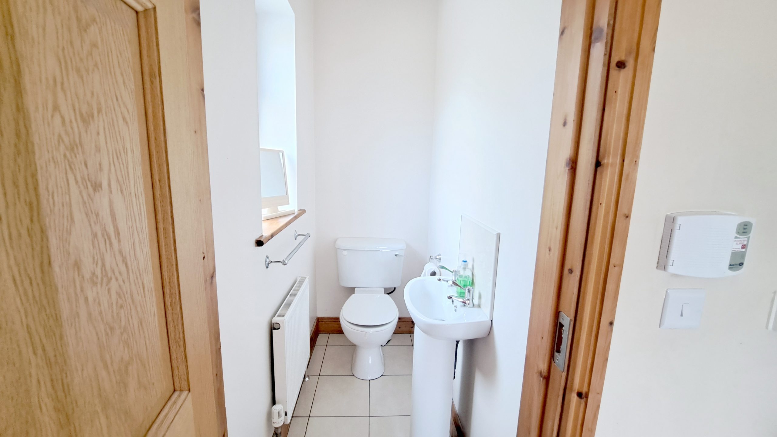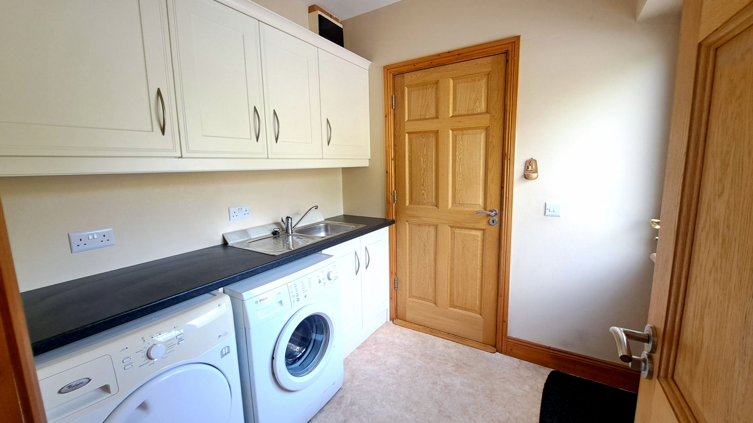 Utility: 2.1 m x 2.15 m, a practical and well-equipped utility room featuring a cream-units, dark worktop, a stainless-steel inset sink, under-counter space for a washing machine and tumble dryer, power points, alarm, back door, Toilet & WHB – 0.9 m x 1.6 m, tiled floor and radiator.