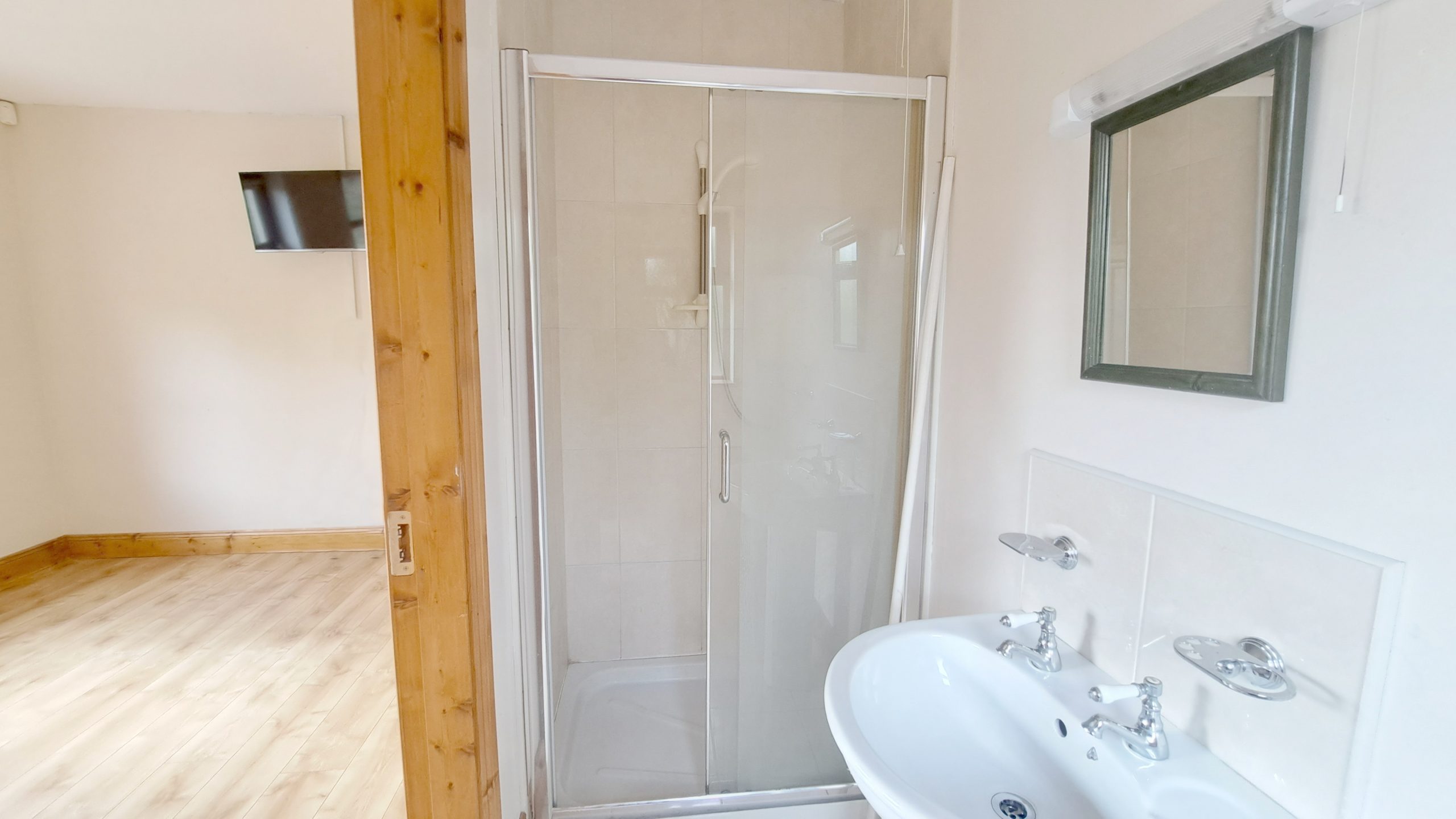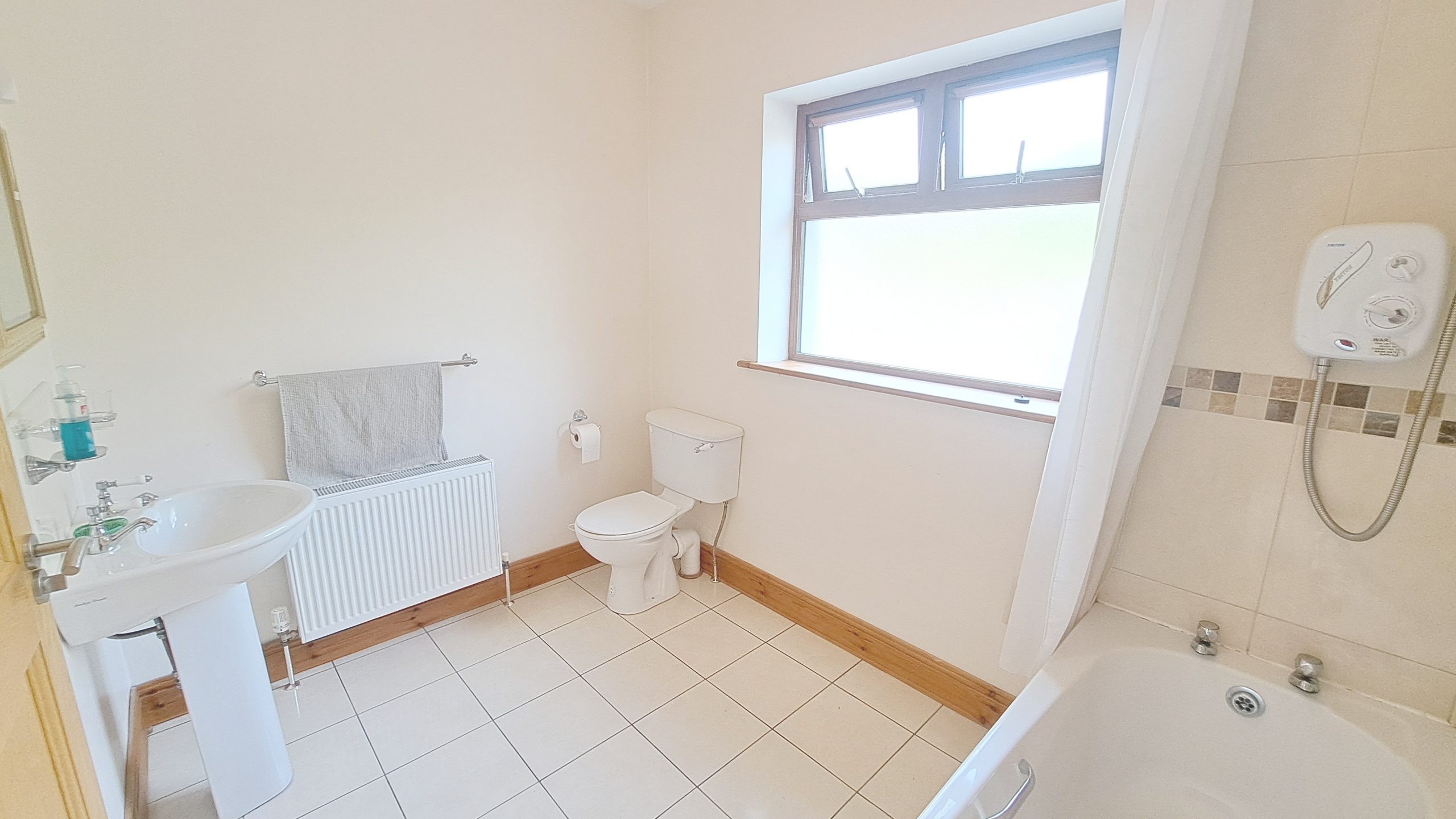 Bathroom: 2.76 m x 2.1 m, generously sized main family bathroom with bath and overhead electric shower, toilet, WHB, tiled floor, double window.